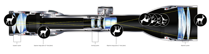 优点是:由于分划版在转像镜组后面,所以分划线在任何倍率,都是一样的粗细,不会受到倍率大小变化的影响,在出厂前,工厂会将测距分划定在某个倍率,一般是在最低倍时,具有测距能力,在高倍时,只起到放大的作用.另外,这种分划板不会因为放大作用而对人的视觉造成影响,即使有小的瑕疵也不会感觉到.