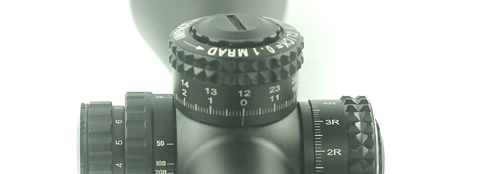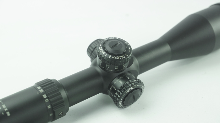 SKWoptics 5-30X56的调节手轮,调节总量仅有2圈,但是调节总量却很大,每圈12MIL(41.24MOA).